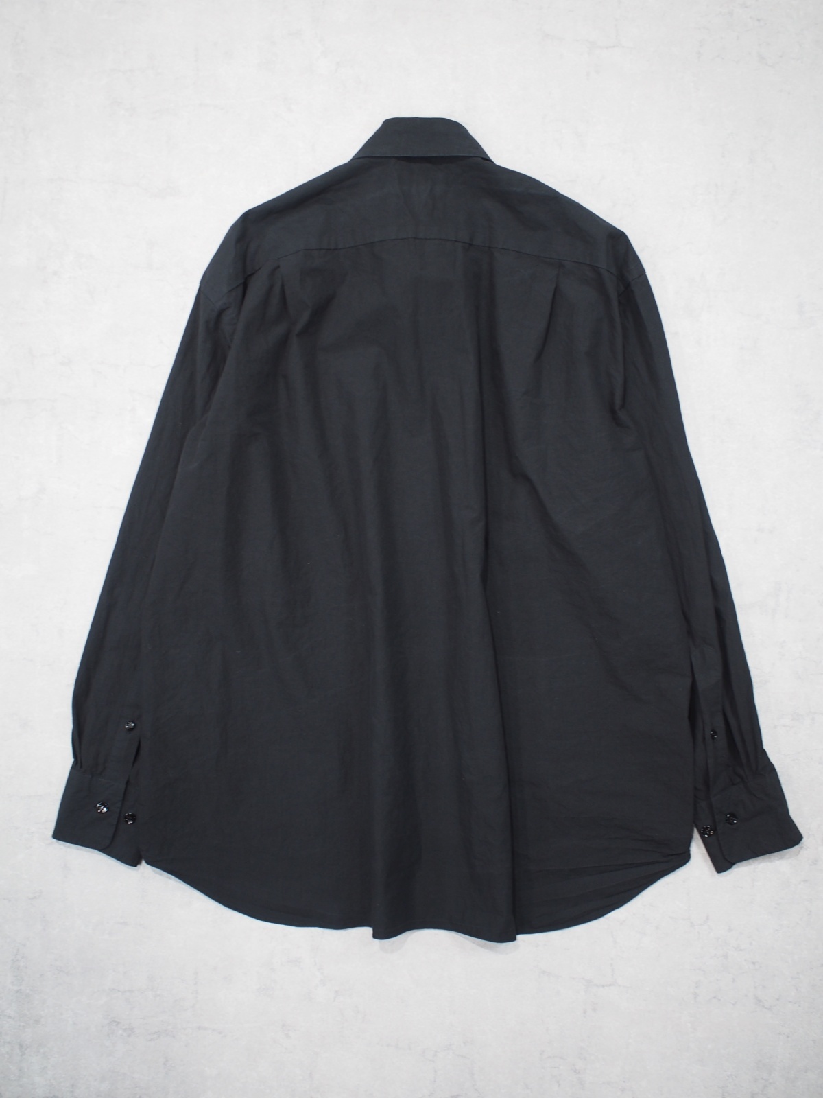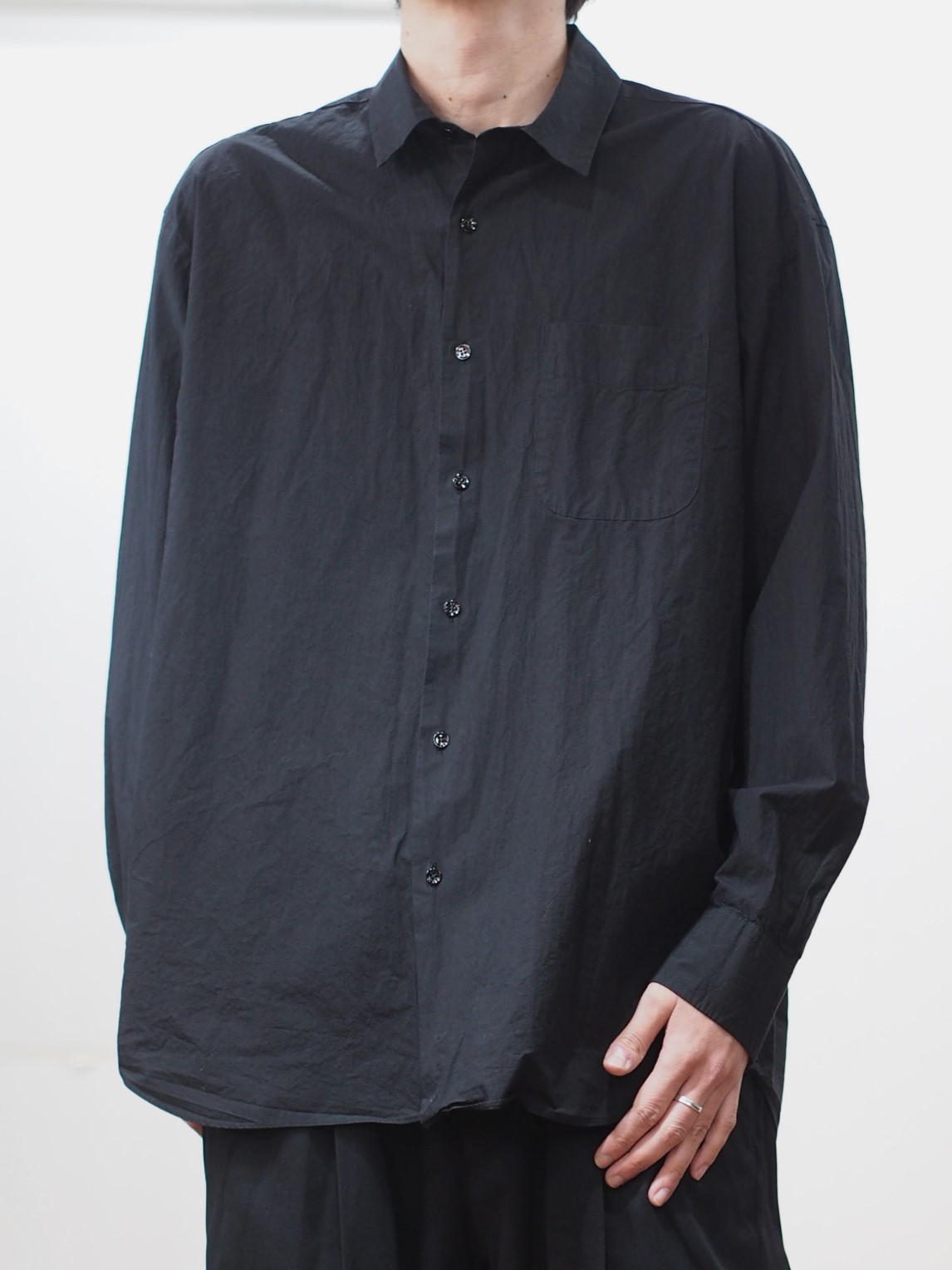 ドレスシャツらしい上品なパターンメイキングで有りながら、程よくドロップしたショルダーライン、ゆったりと広い身幅、力の抜けたルーズなサイズ感が特徴の長袖レギュラーカラーシャツ。
