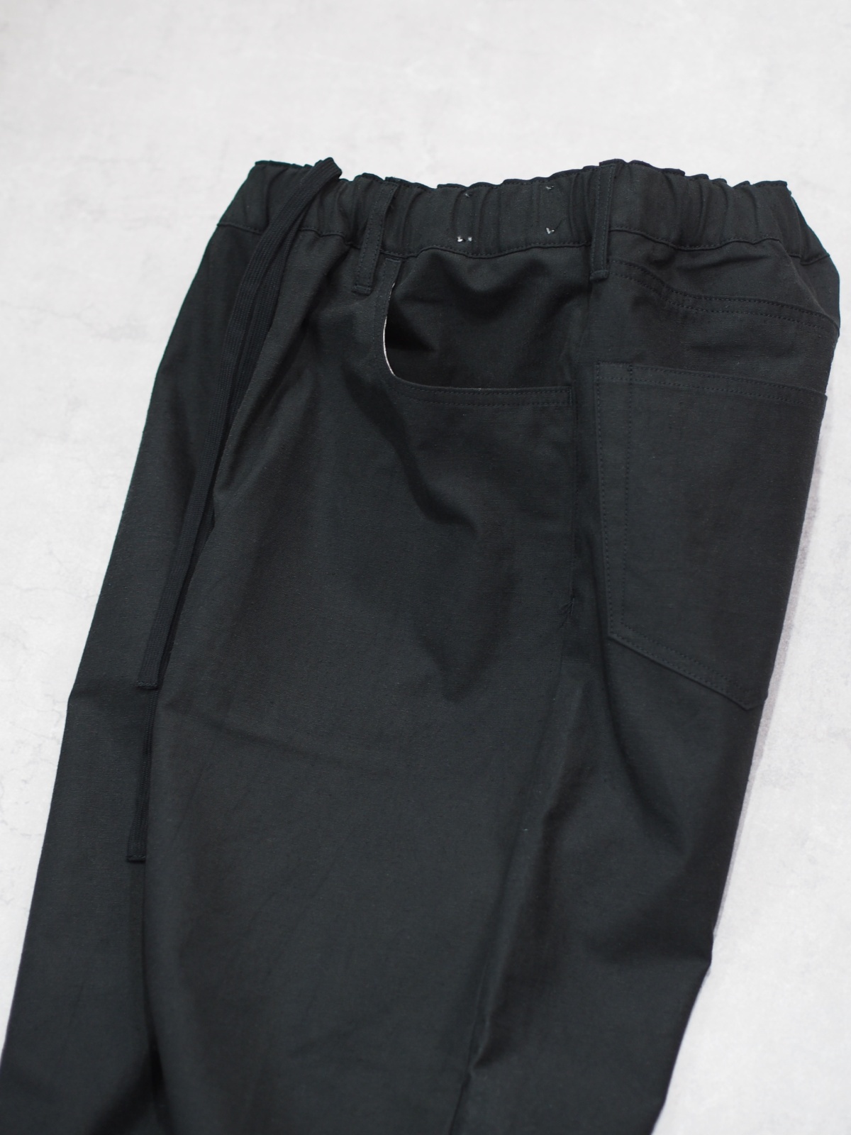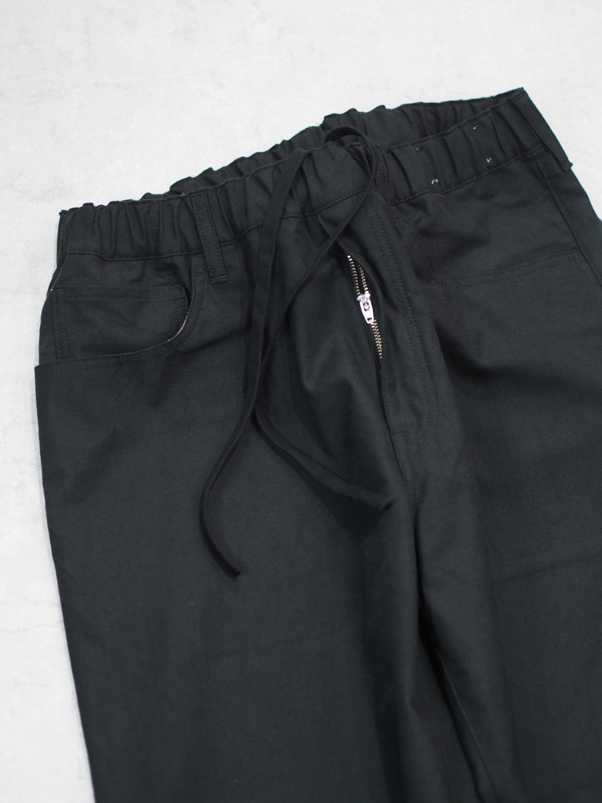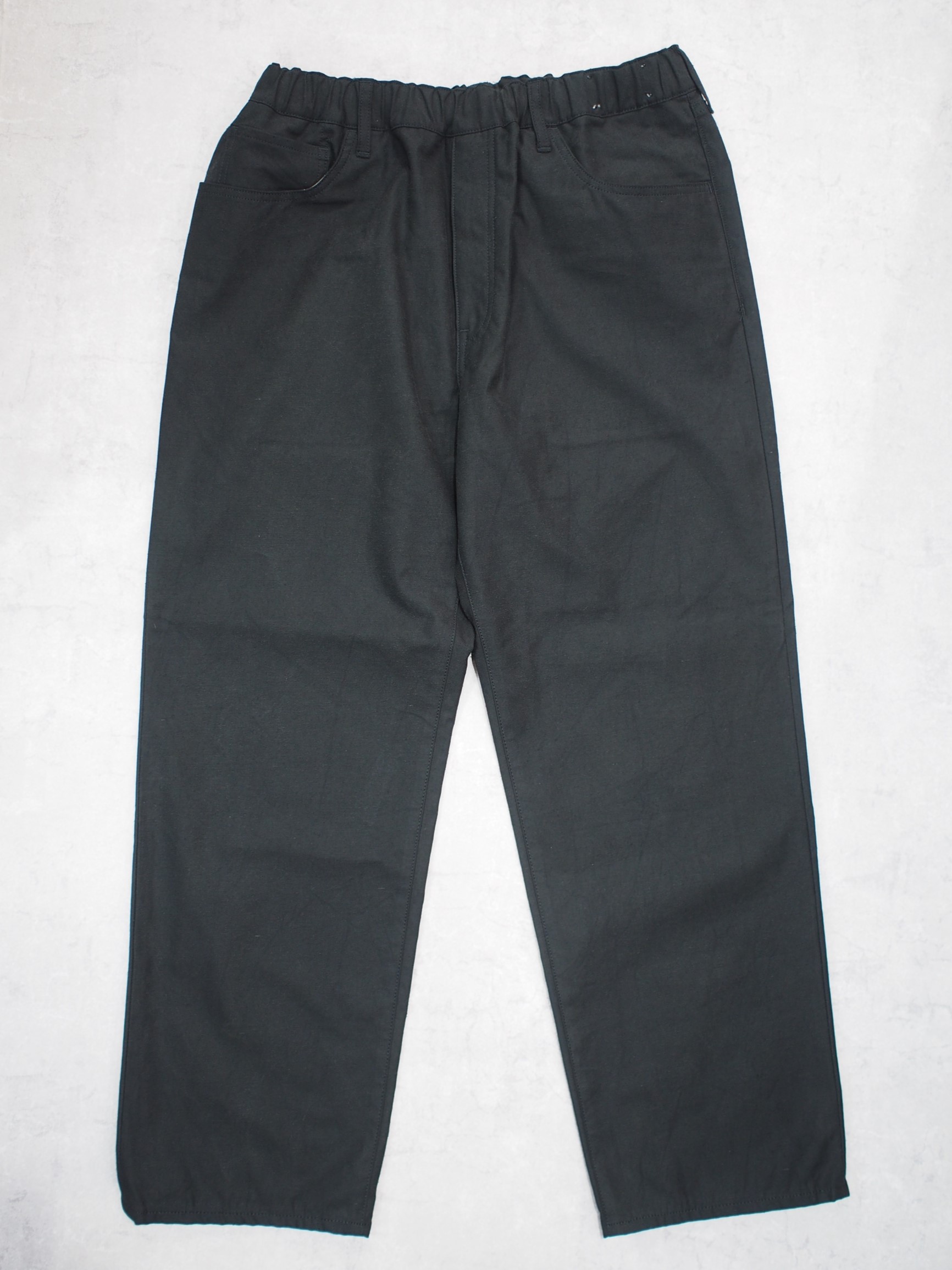 一見シンプルな5ポケットパンツのデザインですが、ウエストにゴムを入れたイージーパンツ仕様となります。
